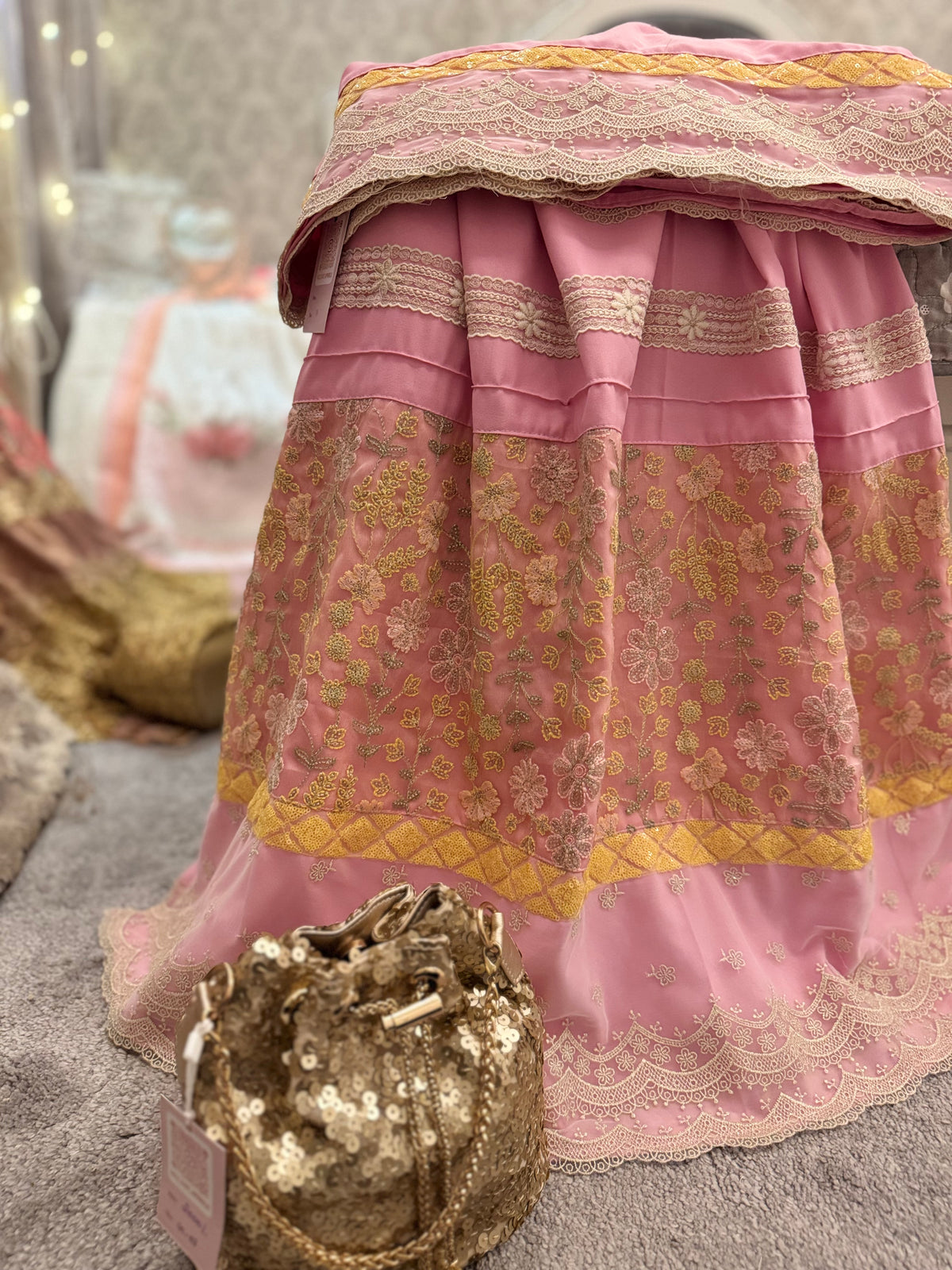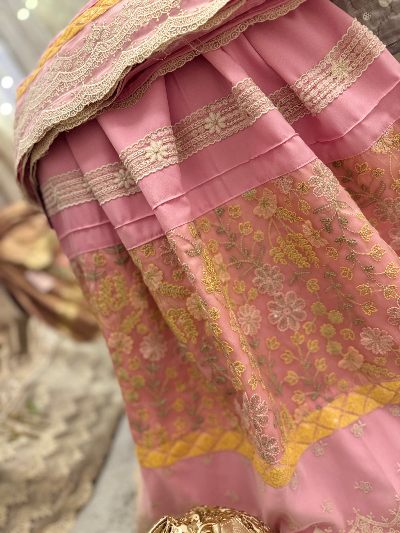 An enchanting blush pink canvas kissed with golden floral embroidery, edged in delicate lace and sunshine yellow borders. Paired with a sequined gold bag, this ensemble is a radiant harmony of grace and grandeur — a timeless treasure for every elegant occasion.