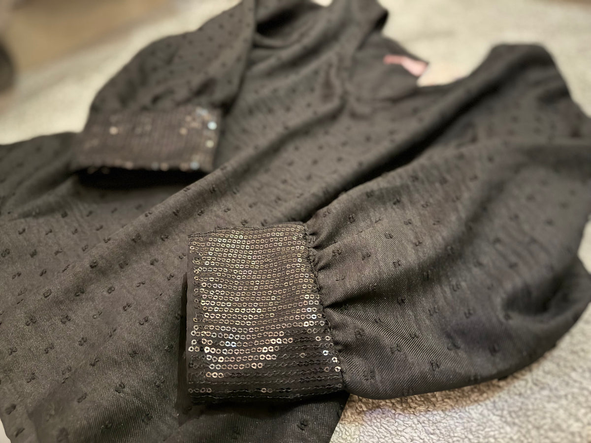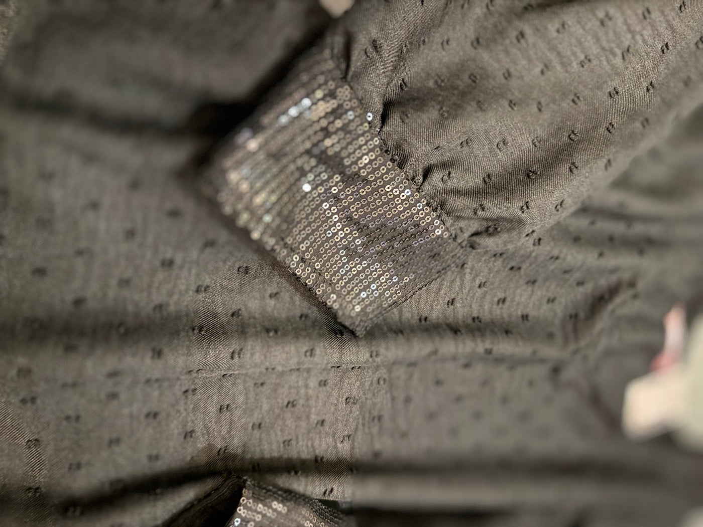 A sleek black dobby-textured top, elevated with shimmering sequin cuffs that add a touch of evening glamour to its understated elegance.