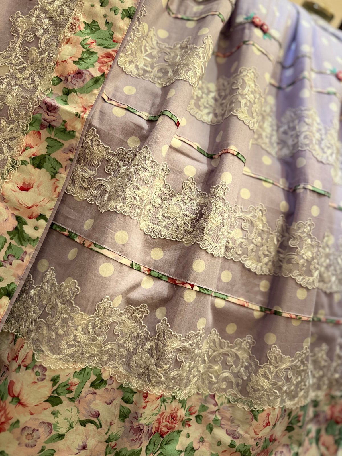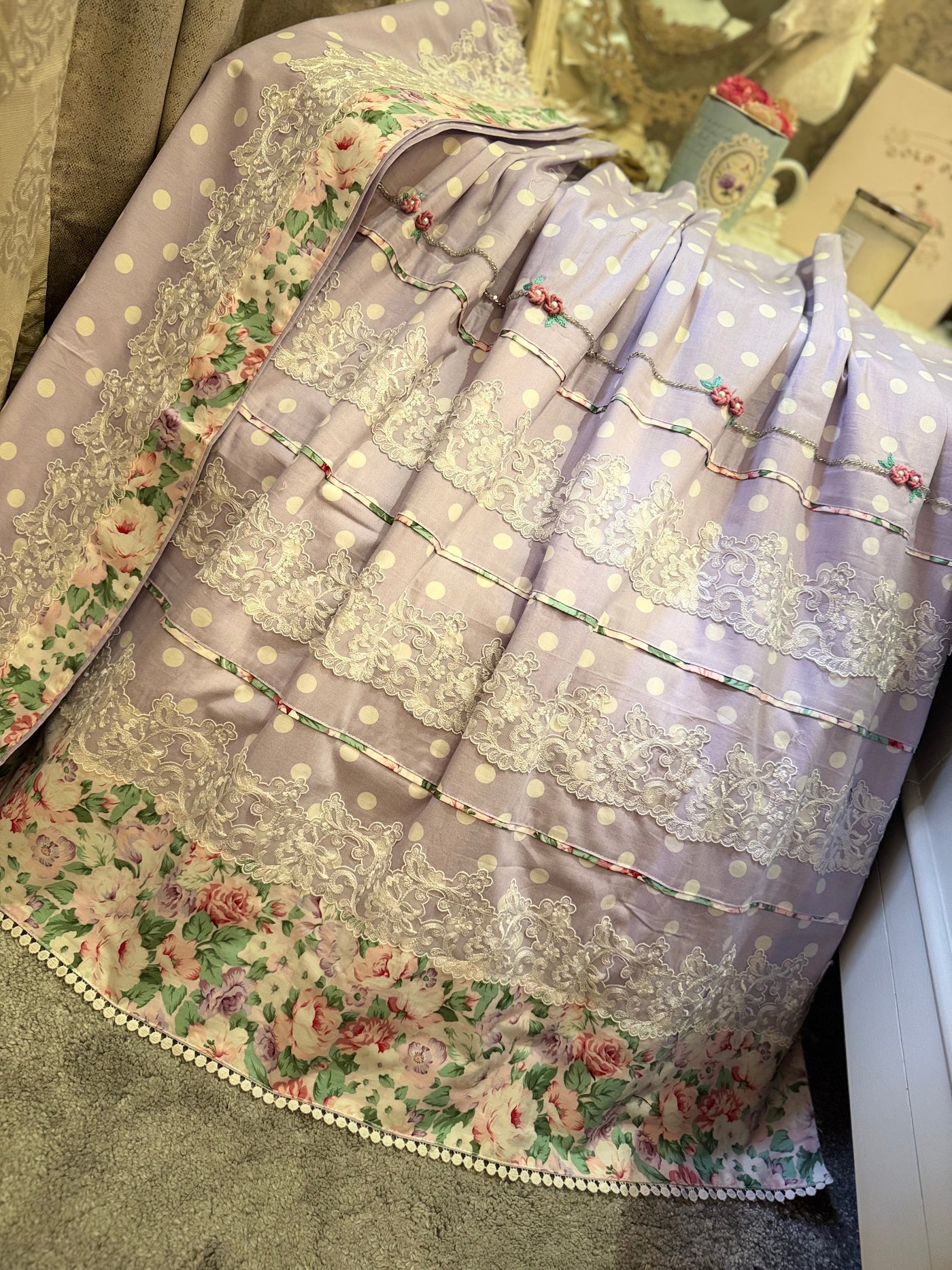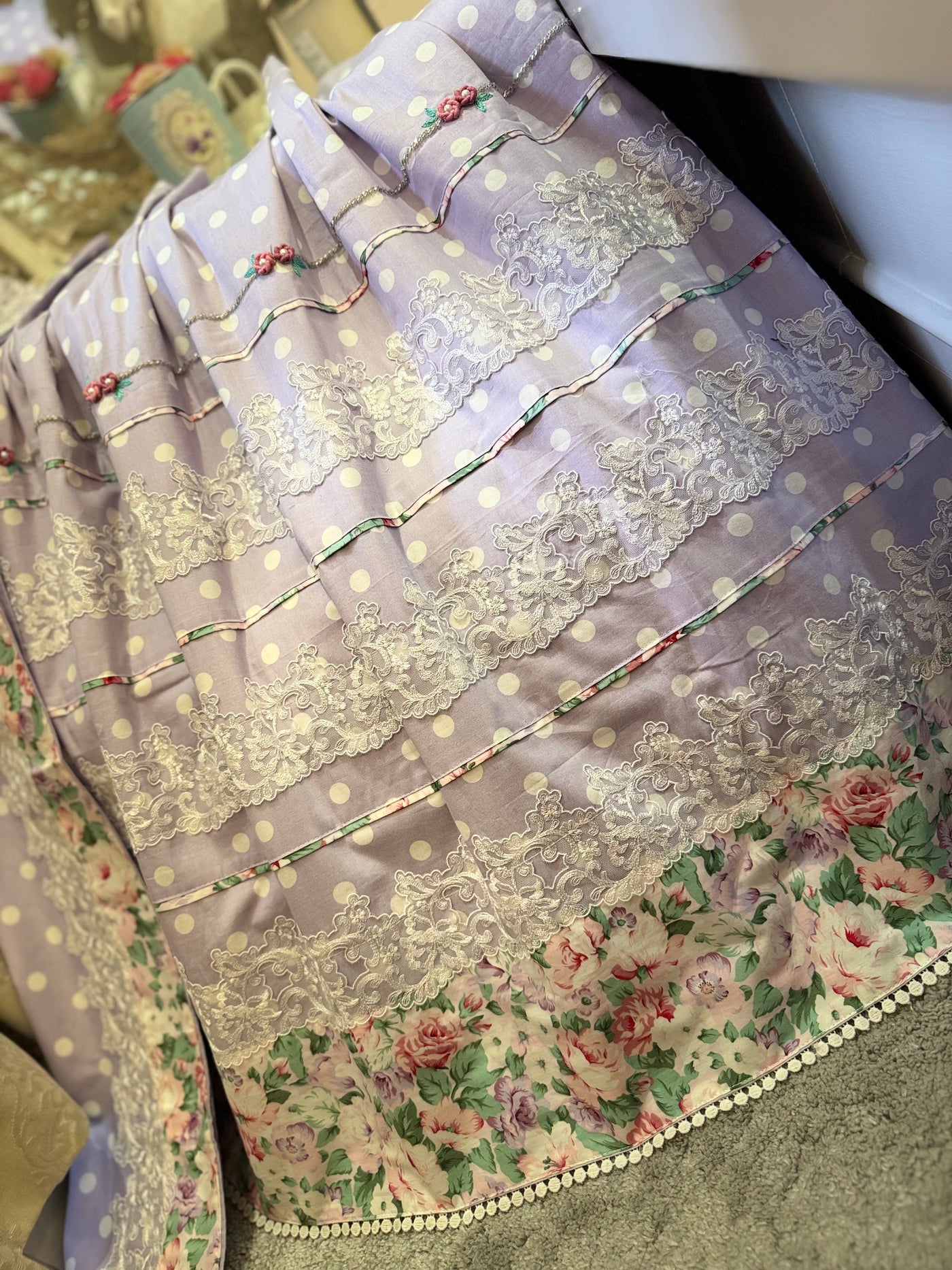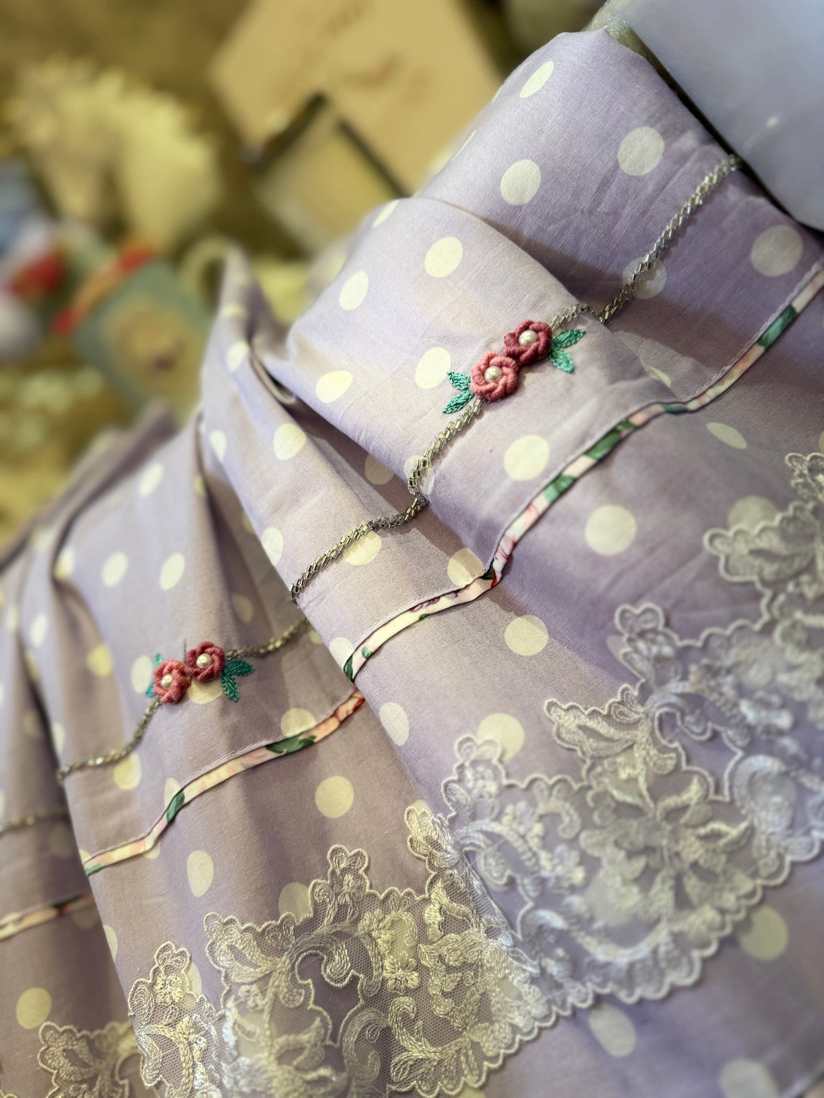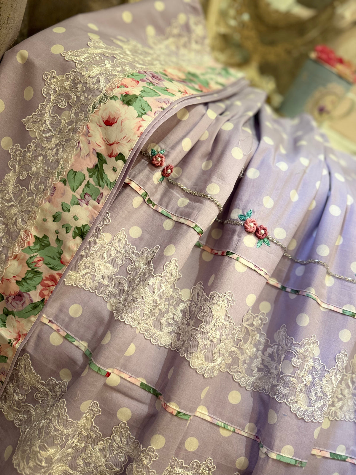 A dreamy lilac canvas kissed with ivory polka dots, ornate lace accents, and delicate rose borders. This piece blends vintage romance with cottage garden charm, perfect for those who adore elegance with a playful flourish.