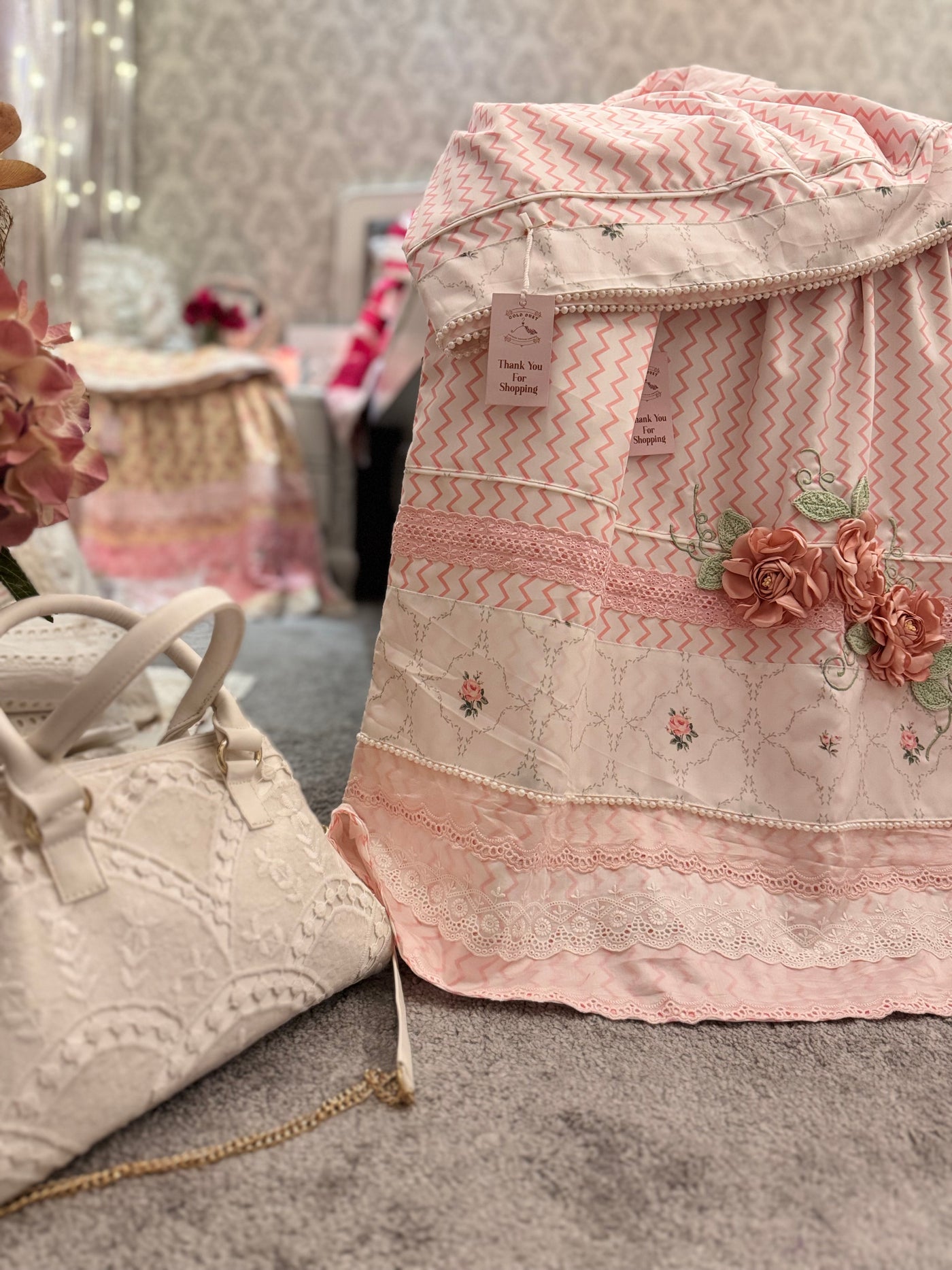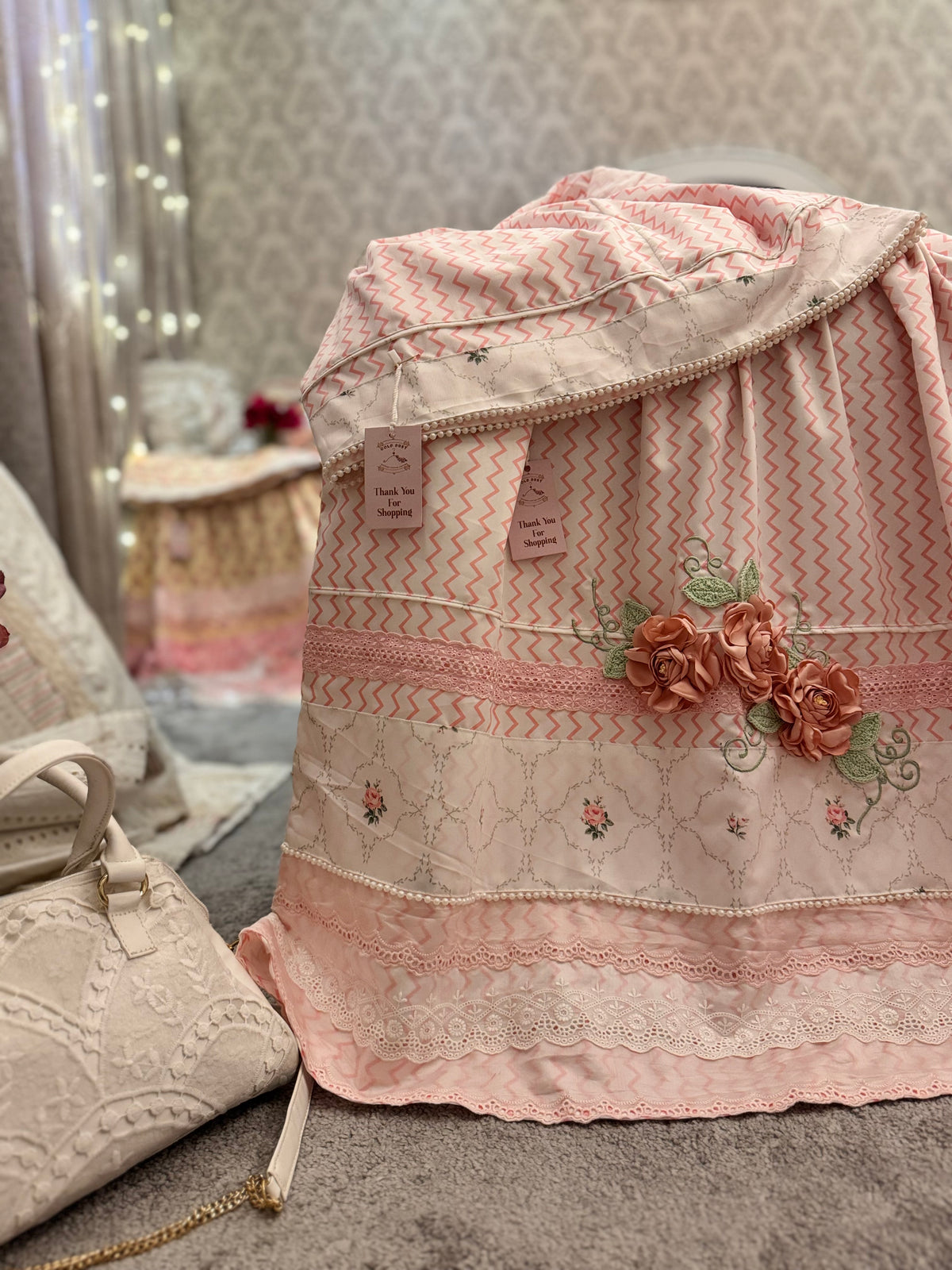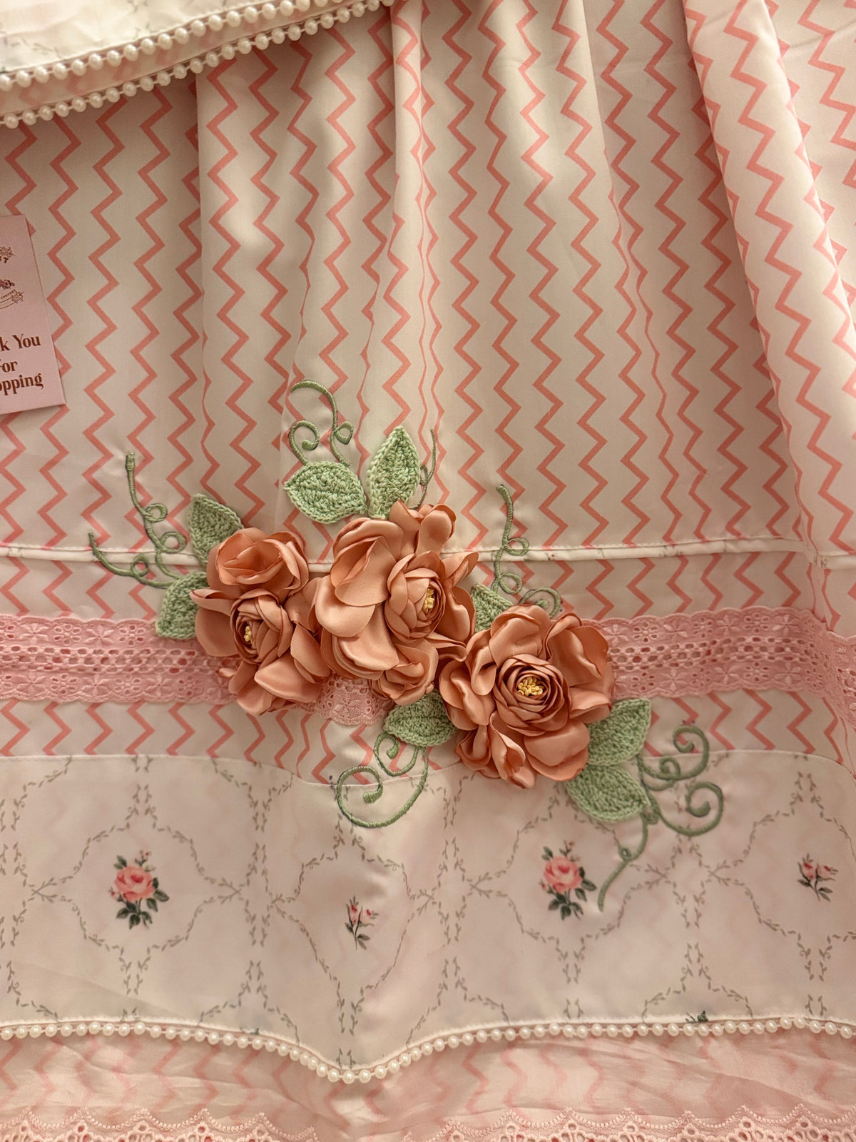 A delicate fusion of tradition and charm, this pastel Rida features soft blush undertones enhanced with zigzag patterns and intricate lace details. The highlight is a cluster of hand-crafted satin roses in peach, beautifully embroidered with green leaves and vines, adding a graceful three-dimensional touch. The lower panel carries floral motifs and scalloped lace borders that radiate vintage elegance.