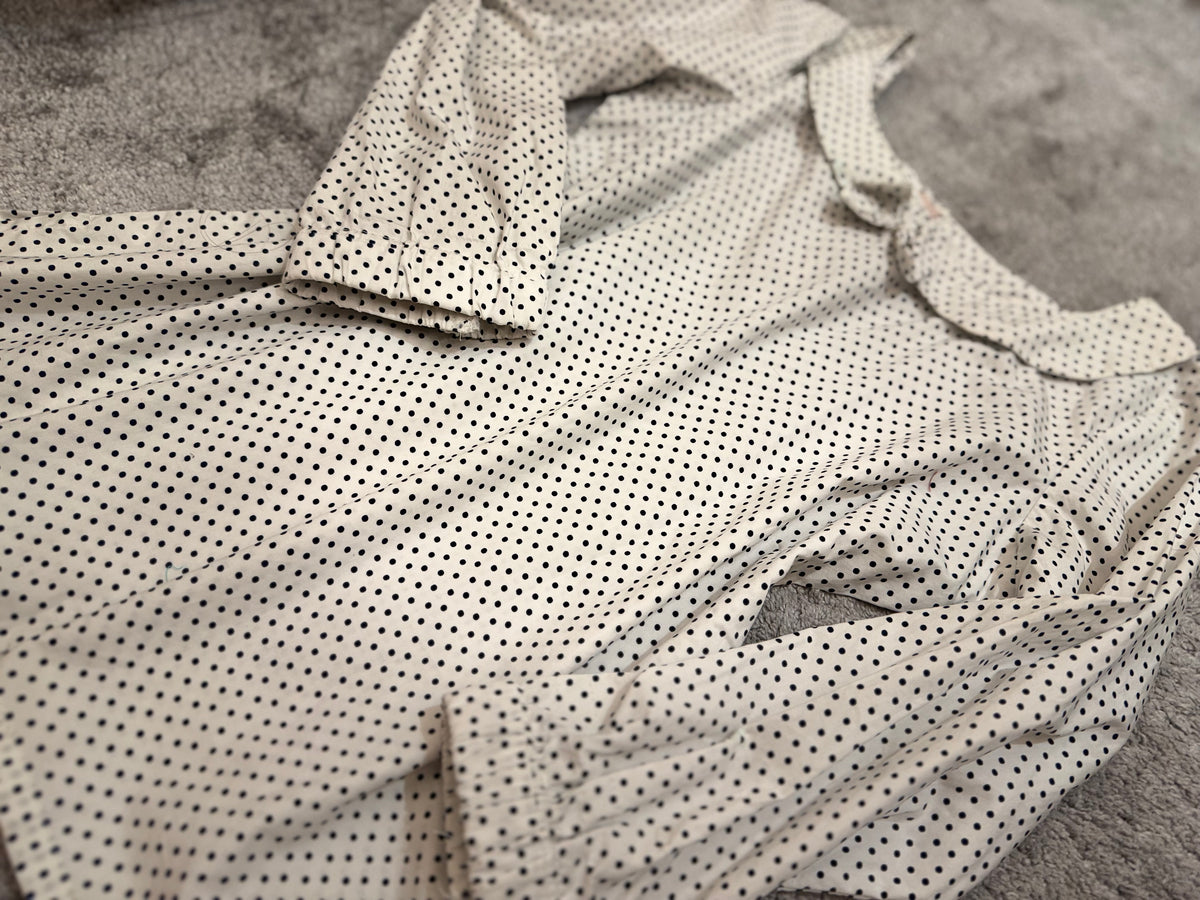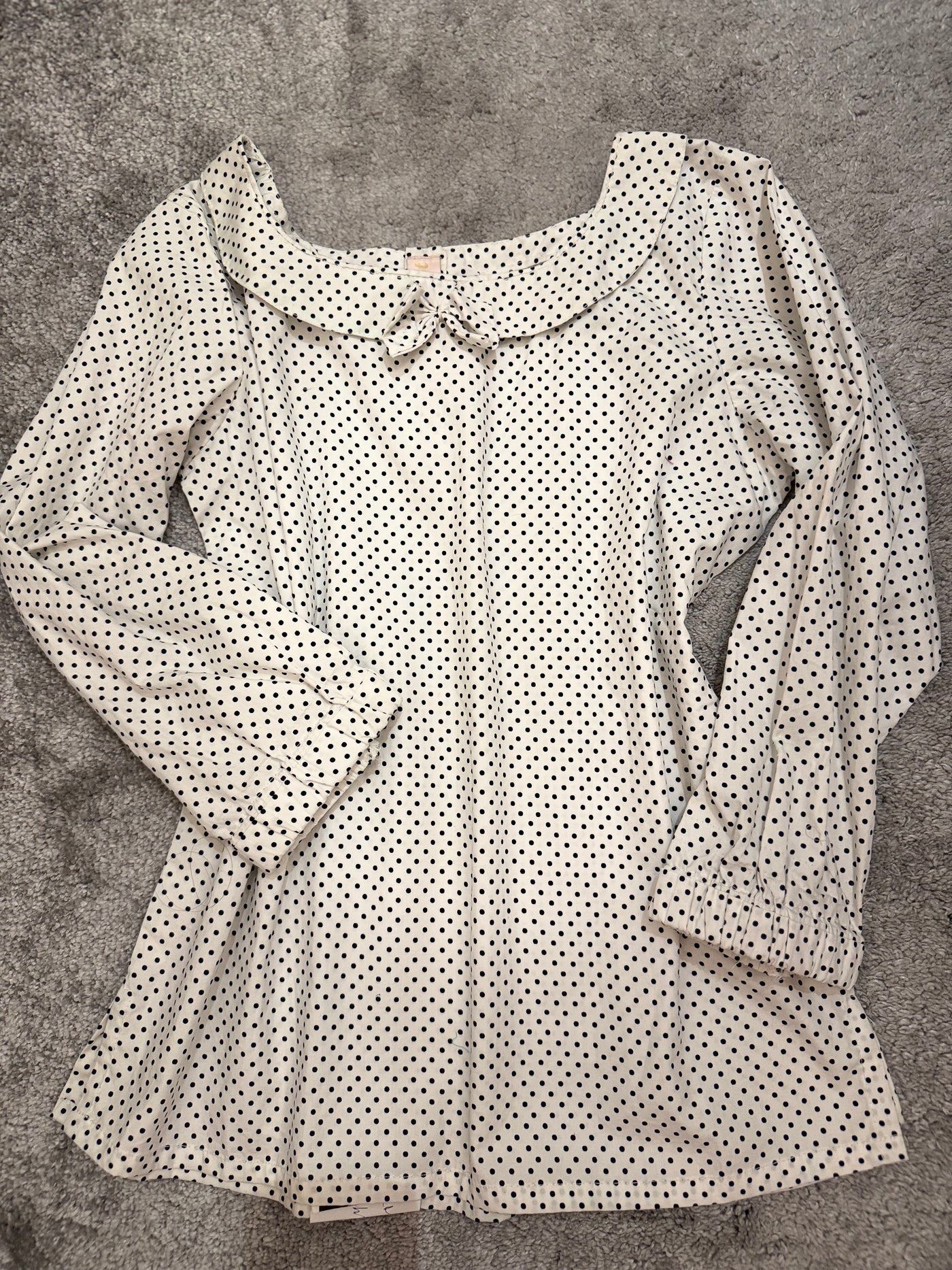 Classic charm meets playful sophistication in this ivory polka-dot blouse, finished with a dainty bow collar. Effortlessly versatile for both casual days and chic evenings.