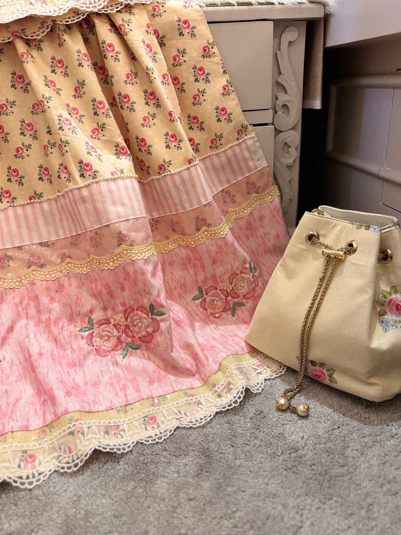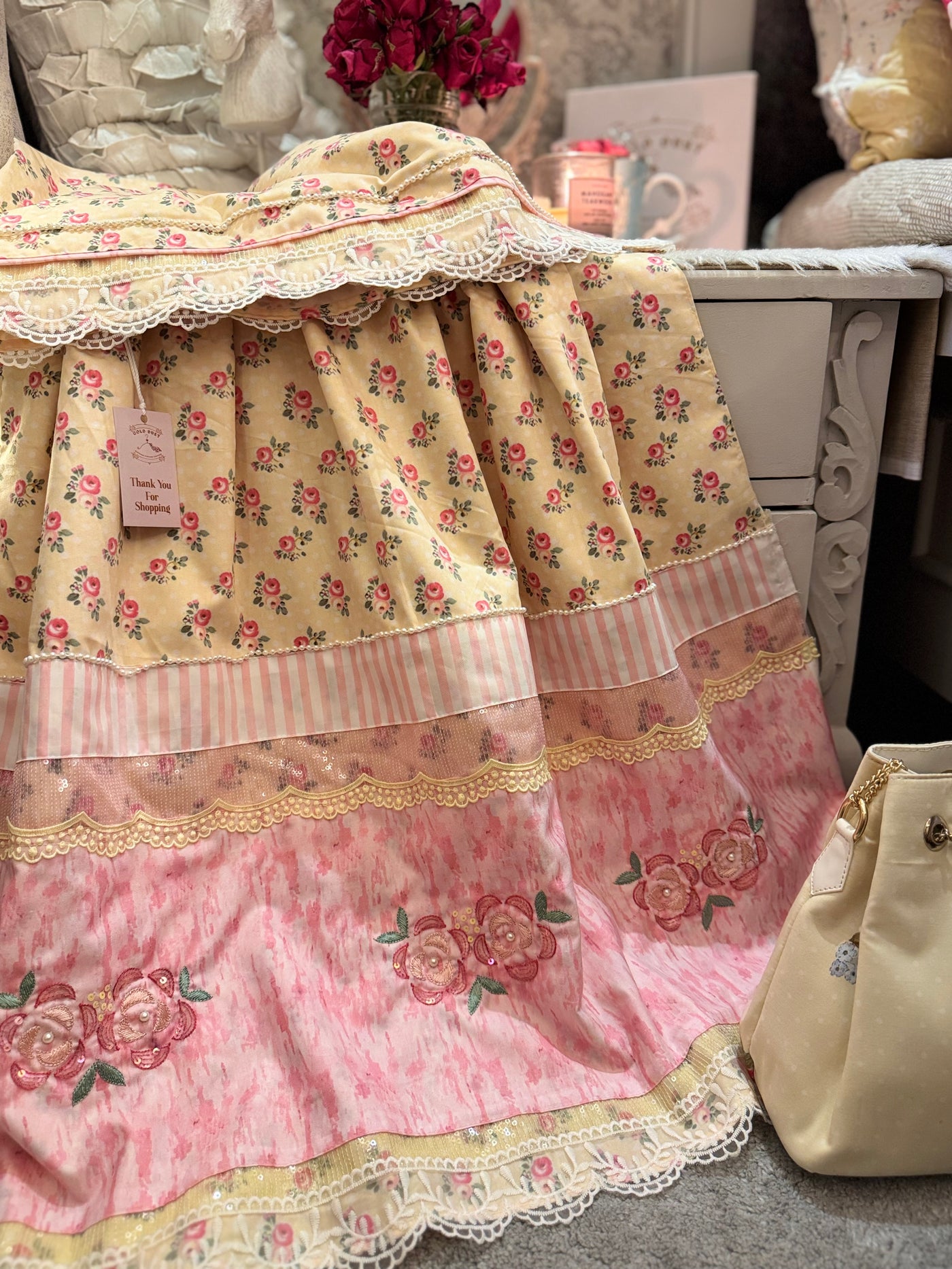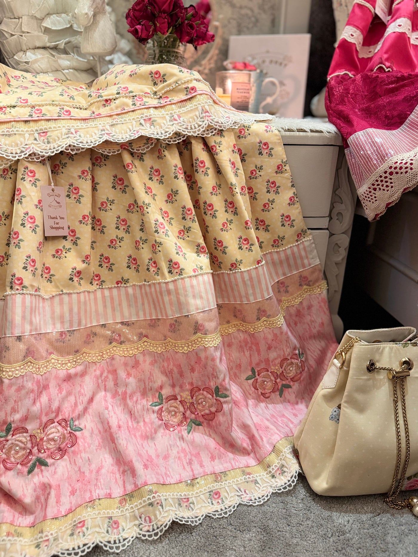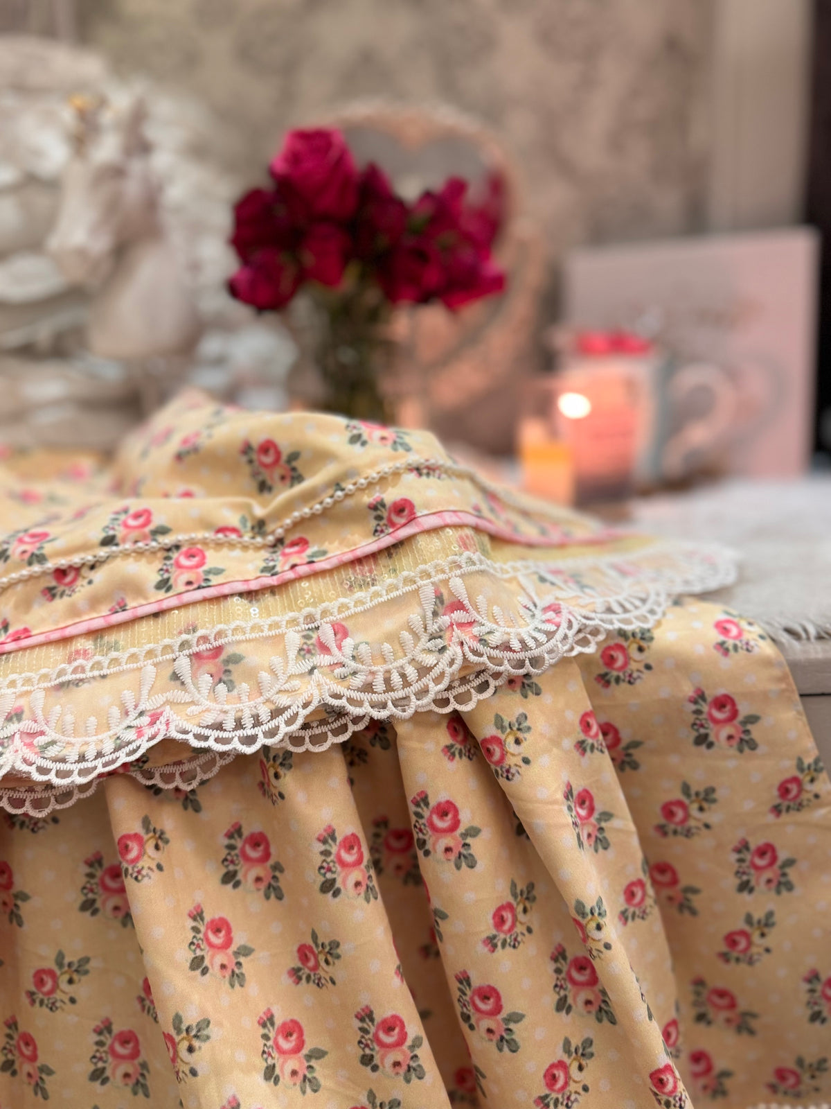 A graceful blend of warmth and elegance, this Rida features a soft mustard-yellow base scattered with delicate rose motifs. The design transitions into striped pastel borders and a dreamy pink marble panel, adorned with embroidered rose clusters for a romantic touch. Golden lace trims and scalloped detailing add subtle shimmer, making the piece radiate timeless femininity.