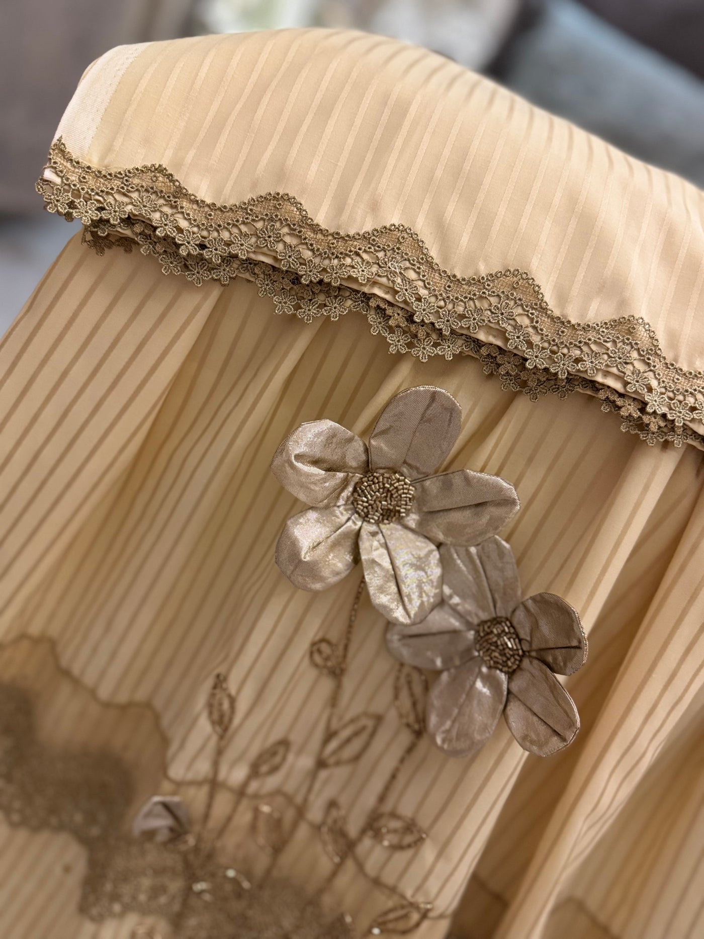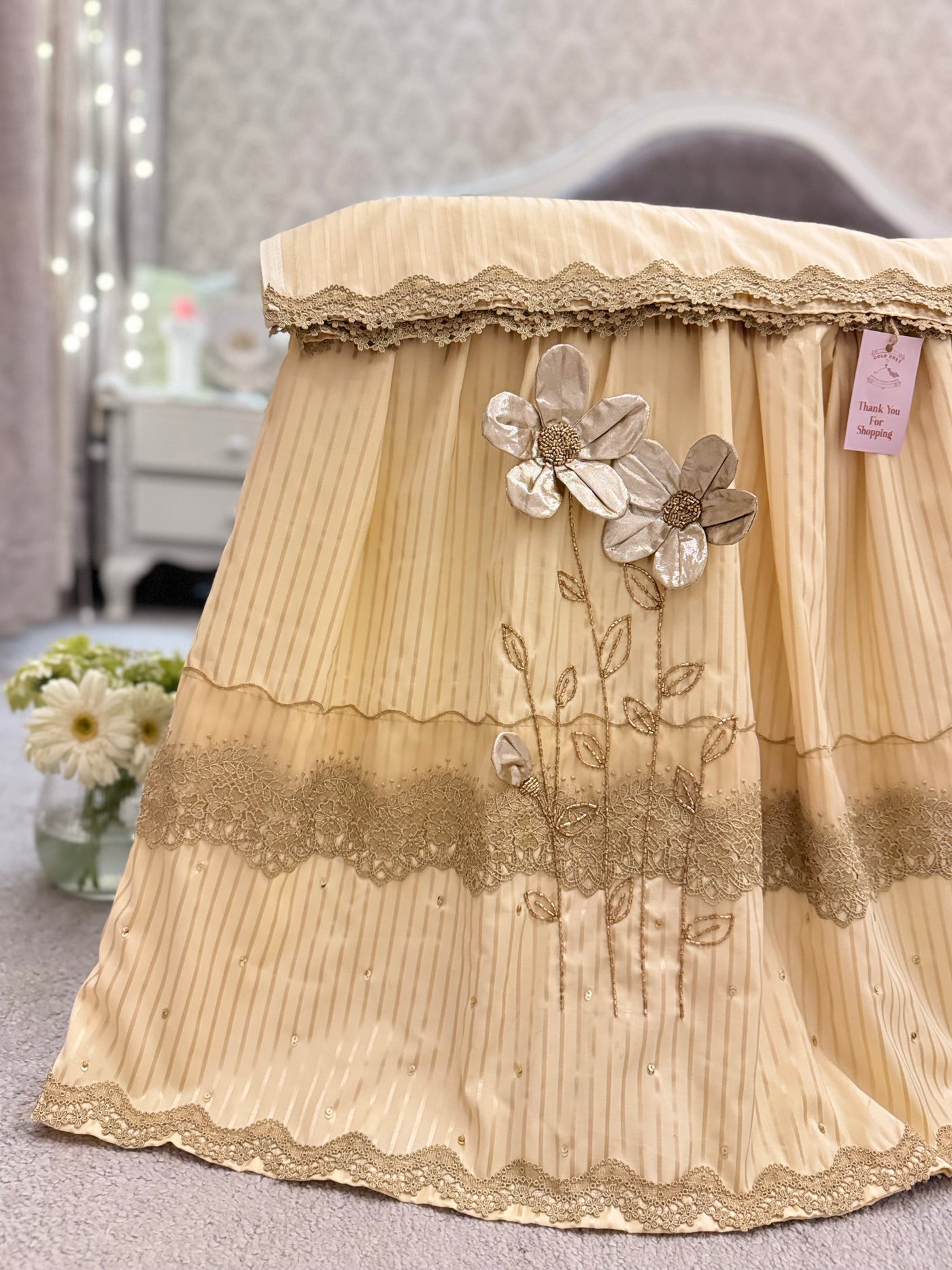 A graceful ivory base with subtle stripe texture, adorned with soft gold floral detailing and lace trims.