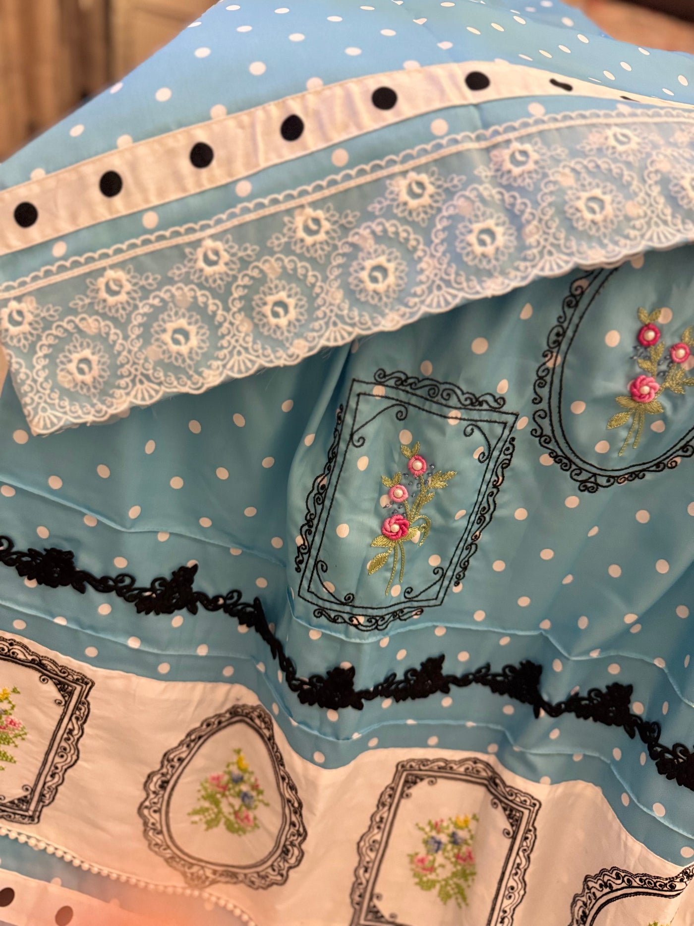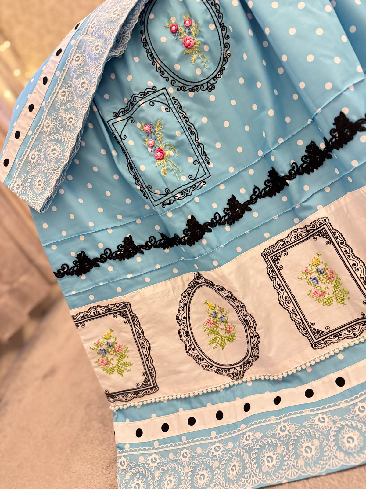 “Azure Cameo” features a serene powder-blue base adorned with classic white polka dots, intricate lace borders, and statement black frame detailing that highlights hand-embroidered floral motifs. The tiered composition balances softness with structure, giving it a refined, heirloom appeal.