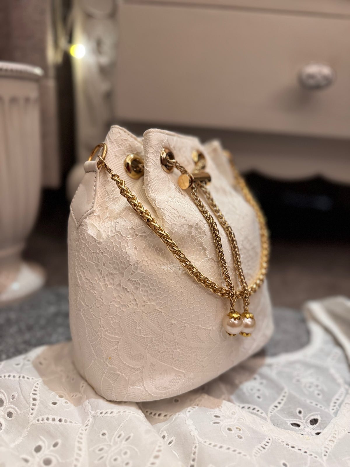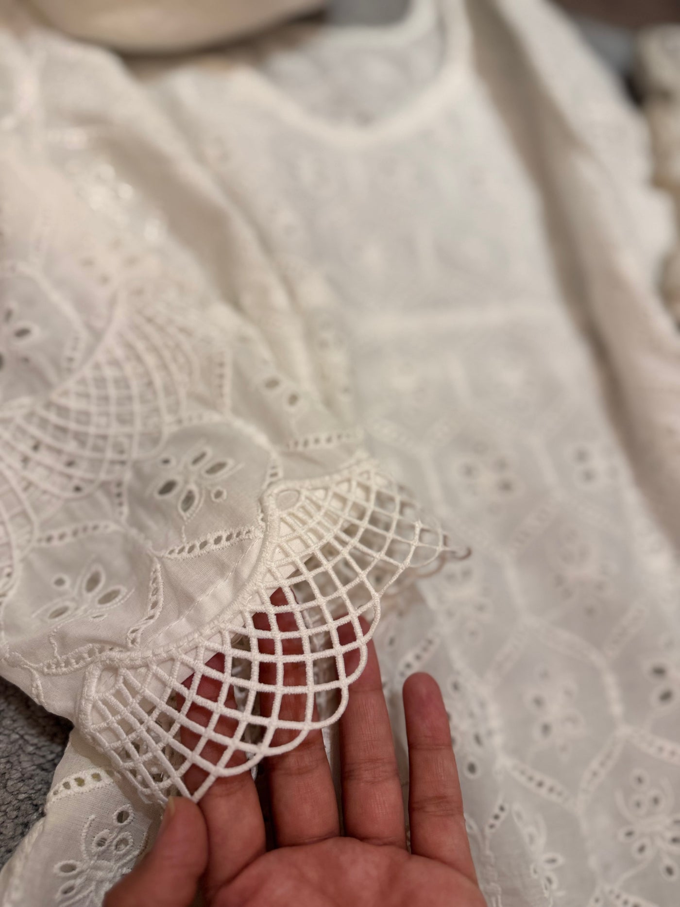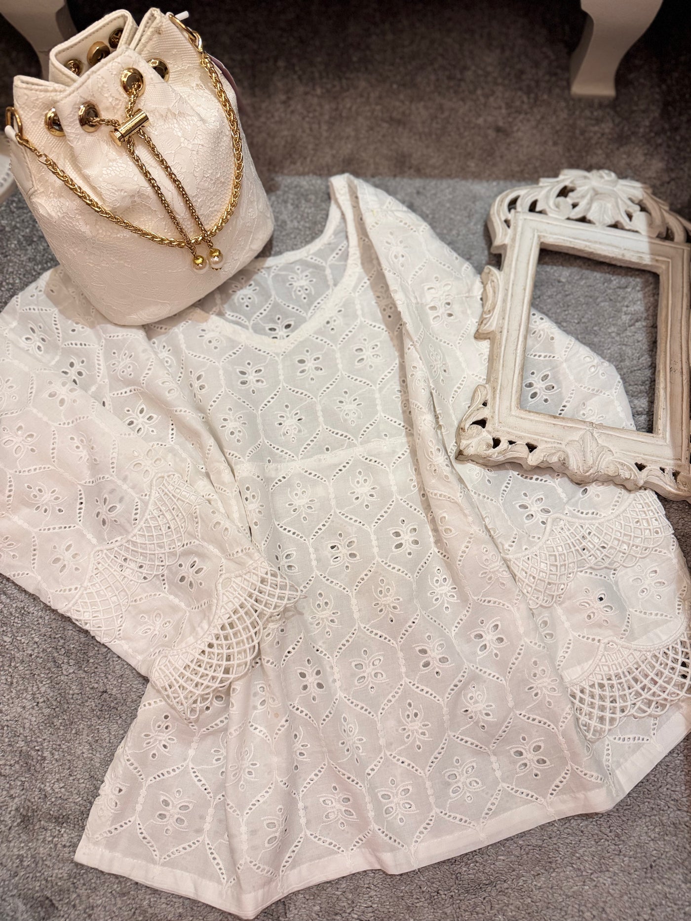 A delicate eyelet kurta paired with a pearl-kissed chantilly bag, weaving grace with whismsical charm.
