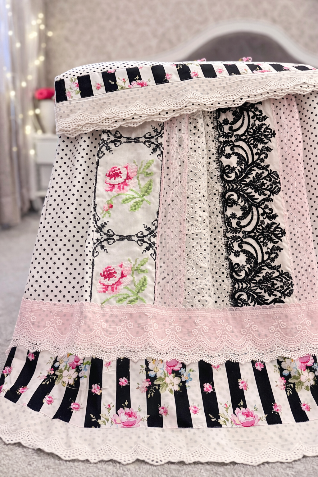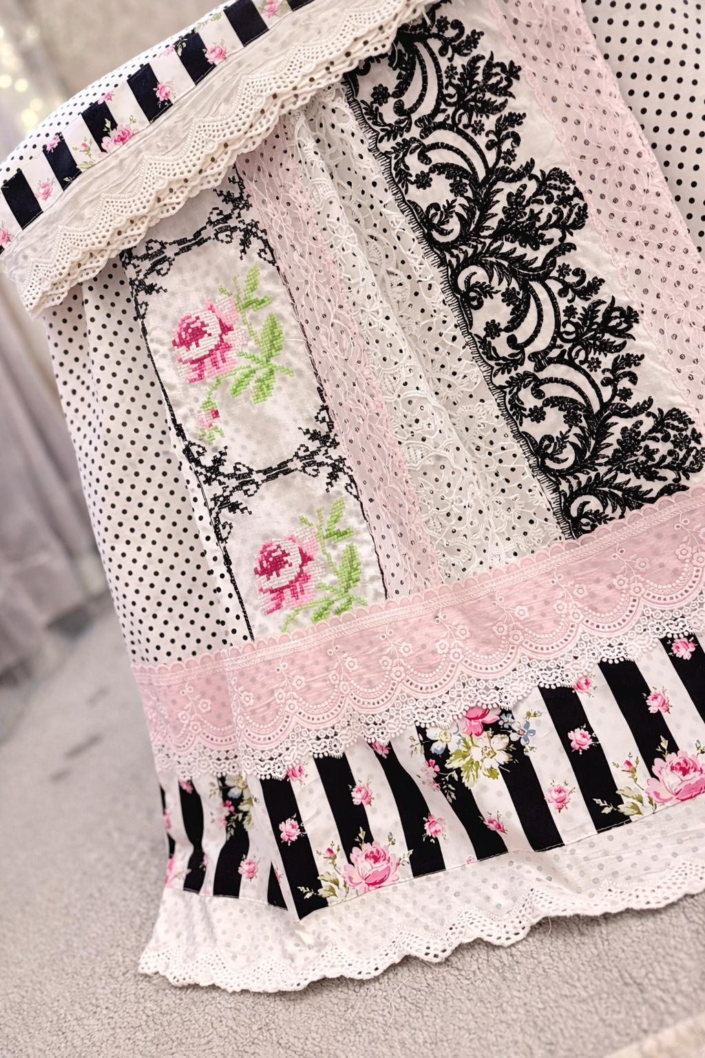 A celebration of timeless romance, Rose Époque brings together classic black-and-white stripes, delicate micro polka dots, and intricate baroque lace panels. Soft blush trims frame hand-detailed cross-stitch roses, creating a piece that feels curated, not crafted in haste.