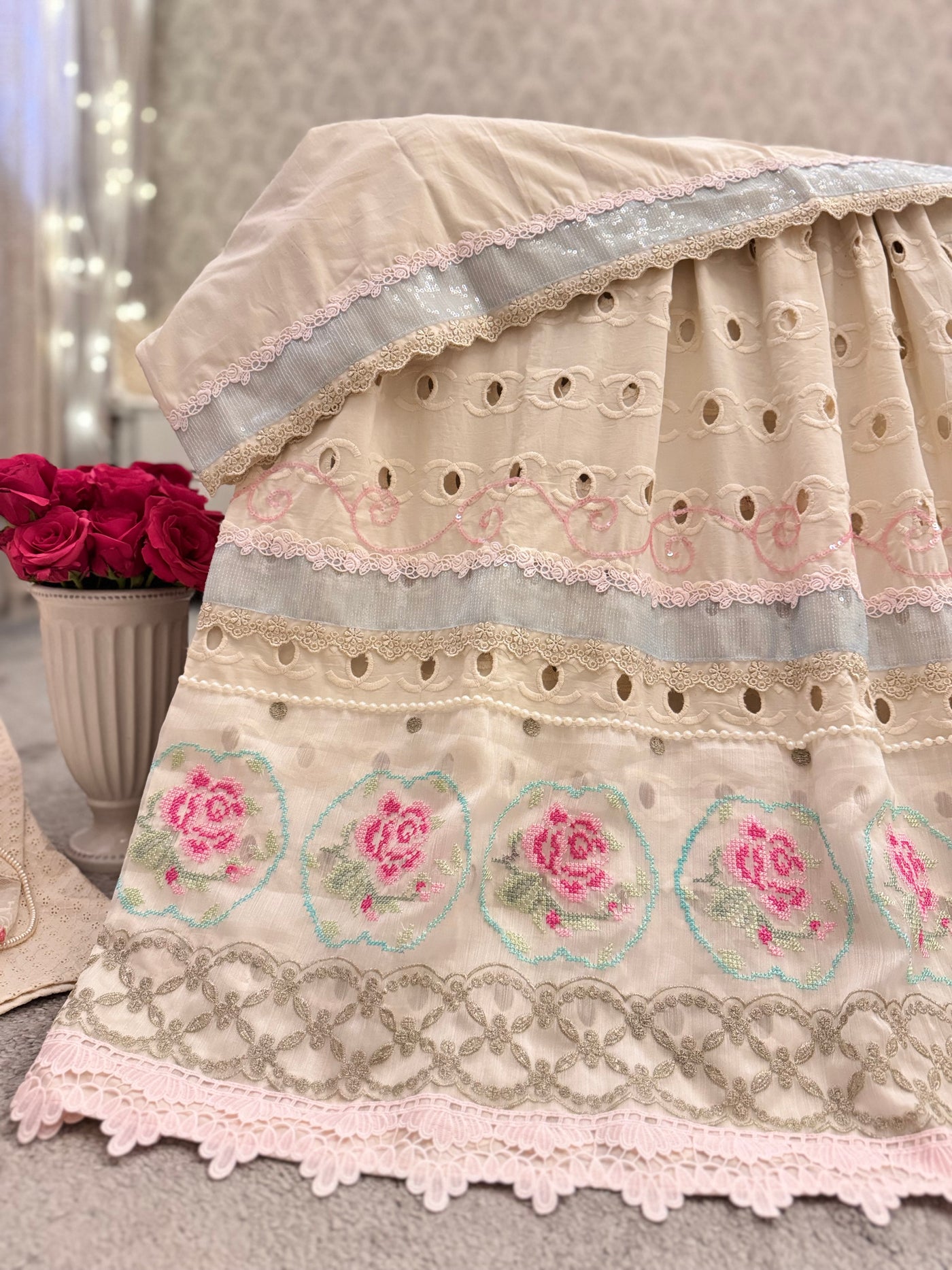 The Rosé Heirloom Ensemble is crafted in a soft ivory base, adorned with layered lace panels, delicate cutwork, and hand-finished rose embroidery that blooms subtly across the detailing.