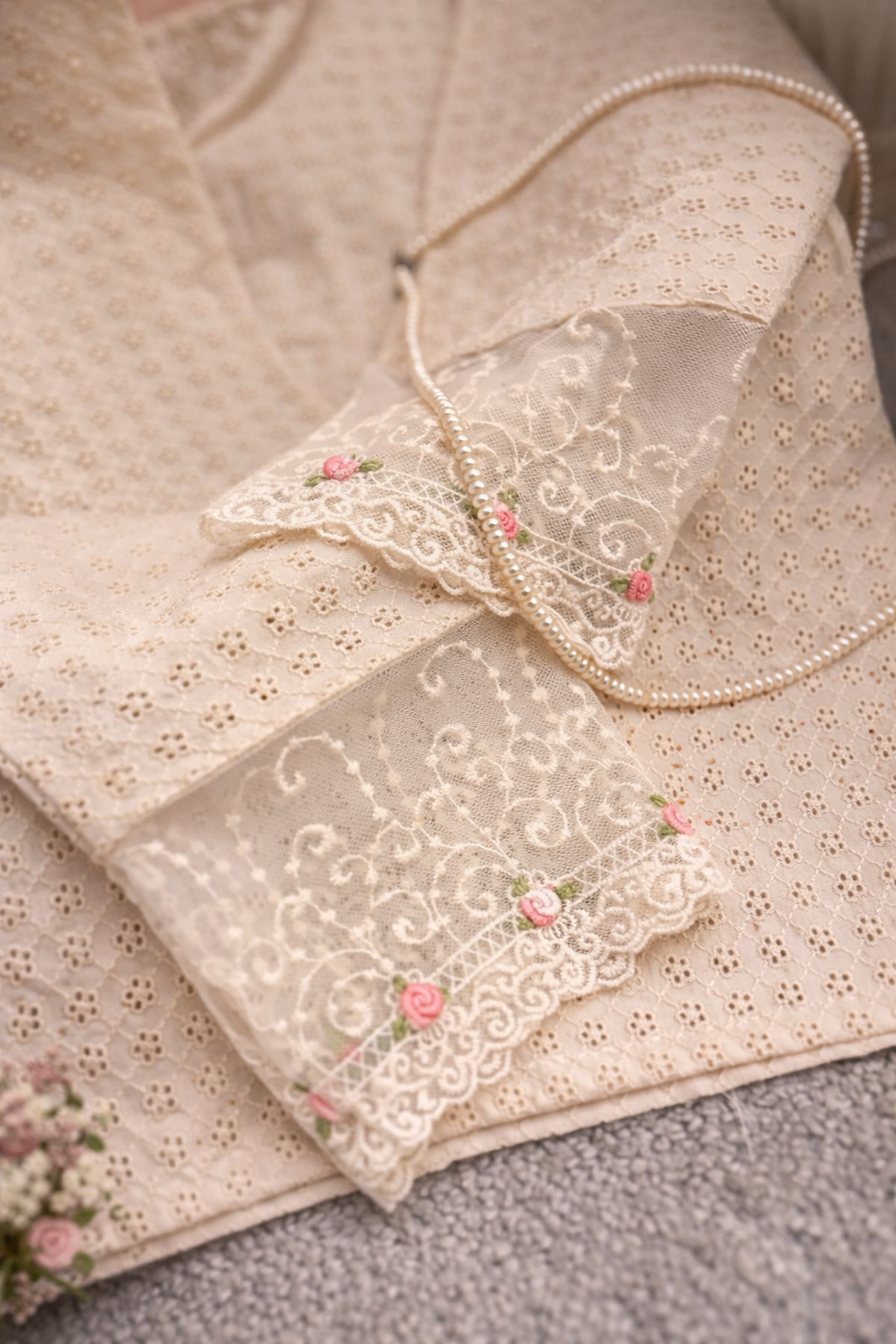 The sleeves feature intricate net lace with miniature rose accents, while pearl embellishments trace the silhouette with quiet refinement. Every element is thoughtfully placed — from the scalloped lace borders to the textured embroidery bands — creating a set that feels both nostalgic and elevated.