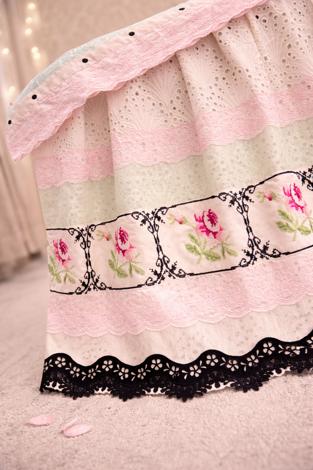 Layered in soft blush lace, mint eyelet textures, and intricate cross-stitched rose panels framed in delicate black vine embroidery, this piece feels like it was discovered in a Victorian cedarwood trunk — preserved, precious, timeless.