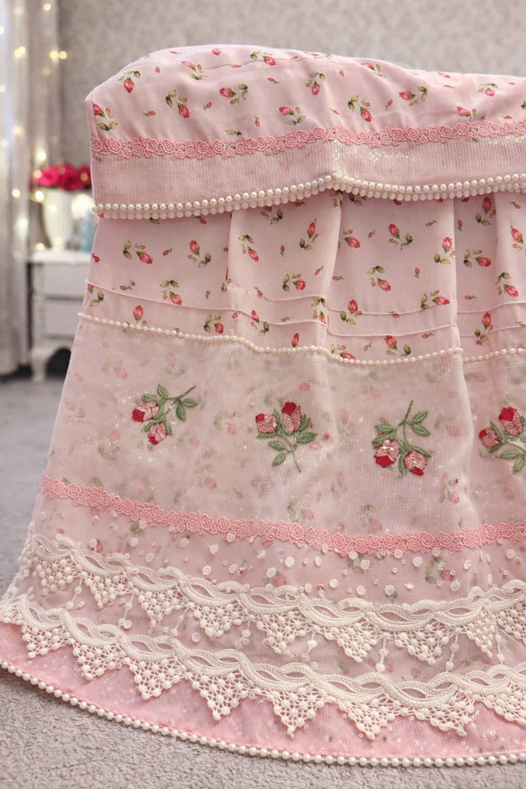A soft blush dream layered in delicate florals and pearl-trimmed elegance.